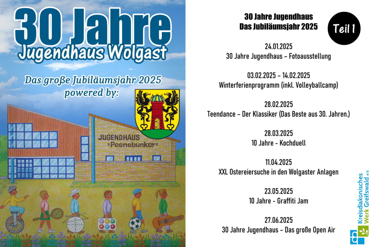 Am Freitag, dem 27.06.2025, wird das Jugendhaus Wolgast auf den Tag genau 30 Jahre alt. Der runde Geburtstag wird aber nicht nur an diesem Freitag gefeiert, sondern das ganze Jahr. Es wird viele tolle Events, Veranstaltungen & Projekte geben für die Kinder und Jugendlichen aus Wolgast sowie dem gesamten Amtsbereich. Das erste Highlight findet am Freitag, dem 24.01.2025, statt. Dort wird es eine Bilderausstellung geben, die 30 Jahre offene Kinder- und Jugendarbeit zeigt.