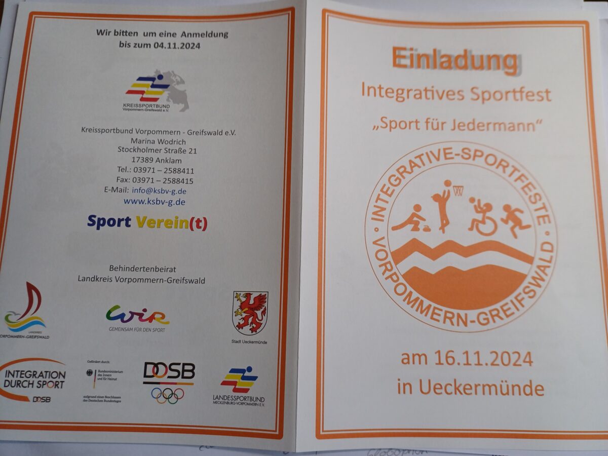 Gemeinsam mit dem Behindertenbeirat des Landkreises Vorpommern-Greifswald lädt der Kreissportbund Vorpommern-Greifswald e.V. zu “Sport für Jedermann” am 16. November nach Ueckermünde ein. Alle Teilnehmer erhalten nach Absolvierung verschiedener Stationen mit sportlichen Angeboten eine Urkunde sowie einen Button. Die Organisatoren freuen sich über zahlreiche Anmeldungen. Für einen kleinen Imbiss, Heiß-und Kaltgetränke sowie jede Menge Spaß ist gesorgt.