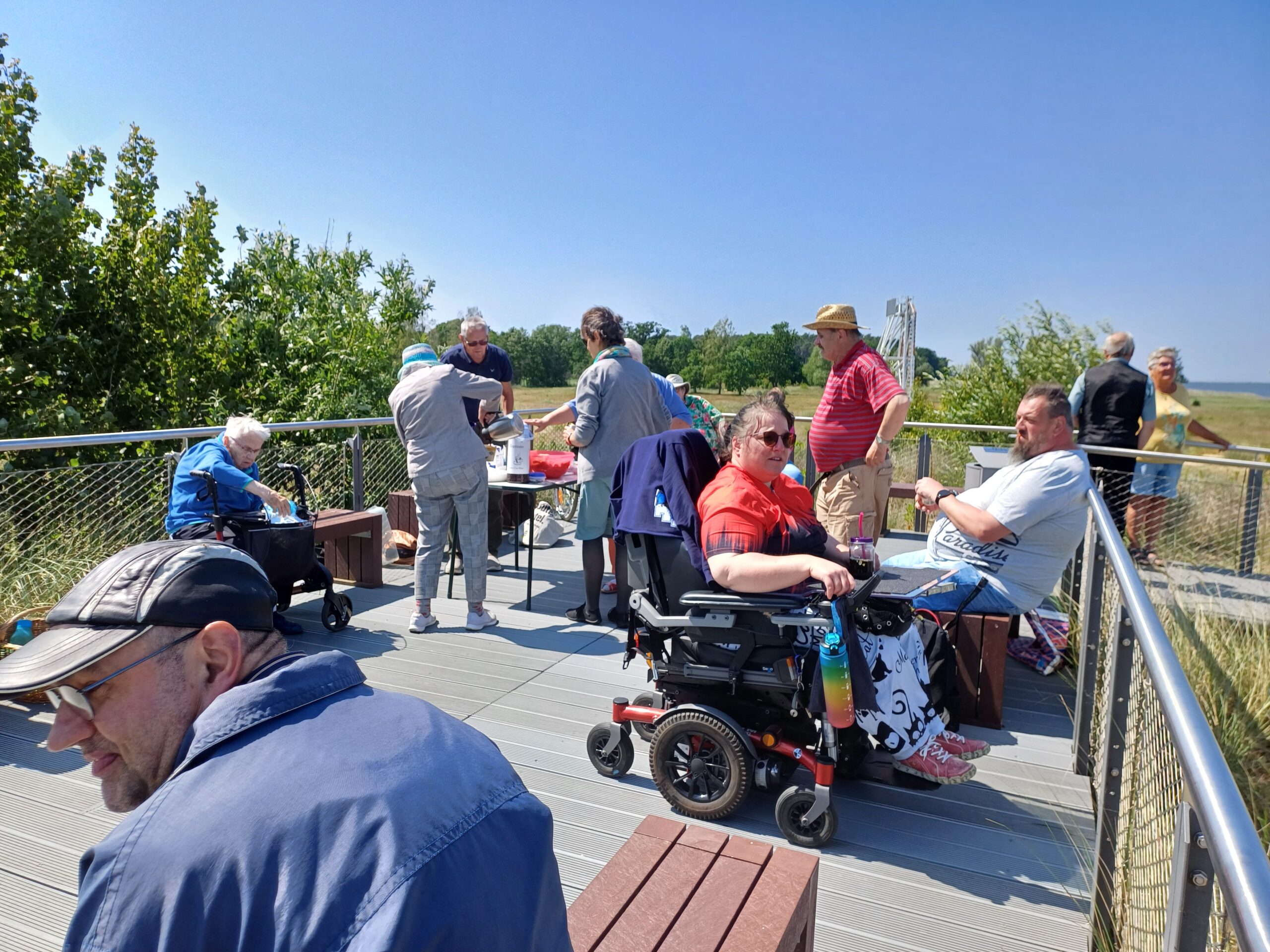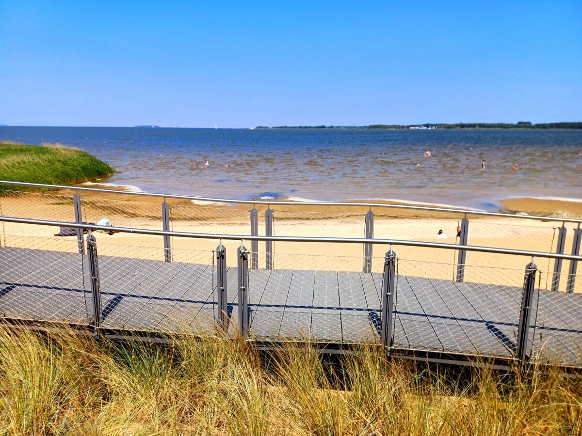 Im Rollstuhl den Freester Strand genießen. Ich hatte es stark gehofft, aber doch so meine leisen Zweifel. Dann kam der Tag des kleinen Ausflugs. Vor über einem Jahr sah ich bei einem Besuch in Freest den neu gestalteten Strandbereich. Der Plan stand. Ein breiter Steg, der unmittelbar vor den Dünen errichtet wurde, führt an seinem Ende zu einer erhöhten Plattform mit Bänken. Einen Campingtisch hatten wir dabei und mitgebrachte Köstlichkeiten konnten aufgebaut werden. Wegen des schönen Wetters hielten sich die meisten Besucher direkt am Strand oder im Wasser auf, so dass wir die Bänke für uns hatten. Die Luft war so klar, dass die Insel Rügen ganz nah erschien und gut sichtbar war. Wenn die Rollstuhlfahrerinnen auch hier nicht direkt ans Wasser kamen, fühlte man sich doch wie mittendrin im Geschehen. Ein Tipp noch am Rande: auch Menschen im Rollstuhl, die ja eigentlich einen Schlüssel zu öffentlichen Behindertentoiletten besitzen, können diese am Freester Strand ebenfalls nur mit dem Einsatz von 0,50€ öffnen. U. Kühlbach