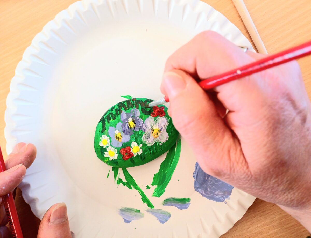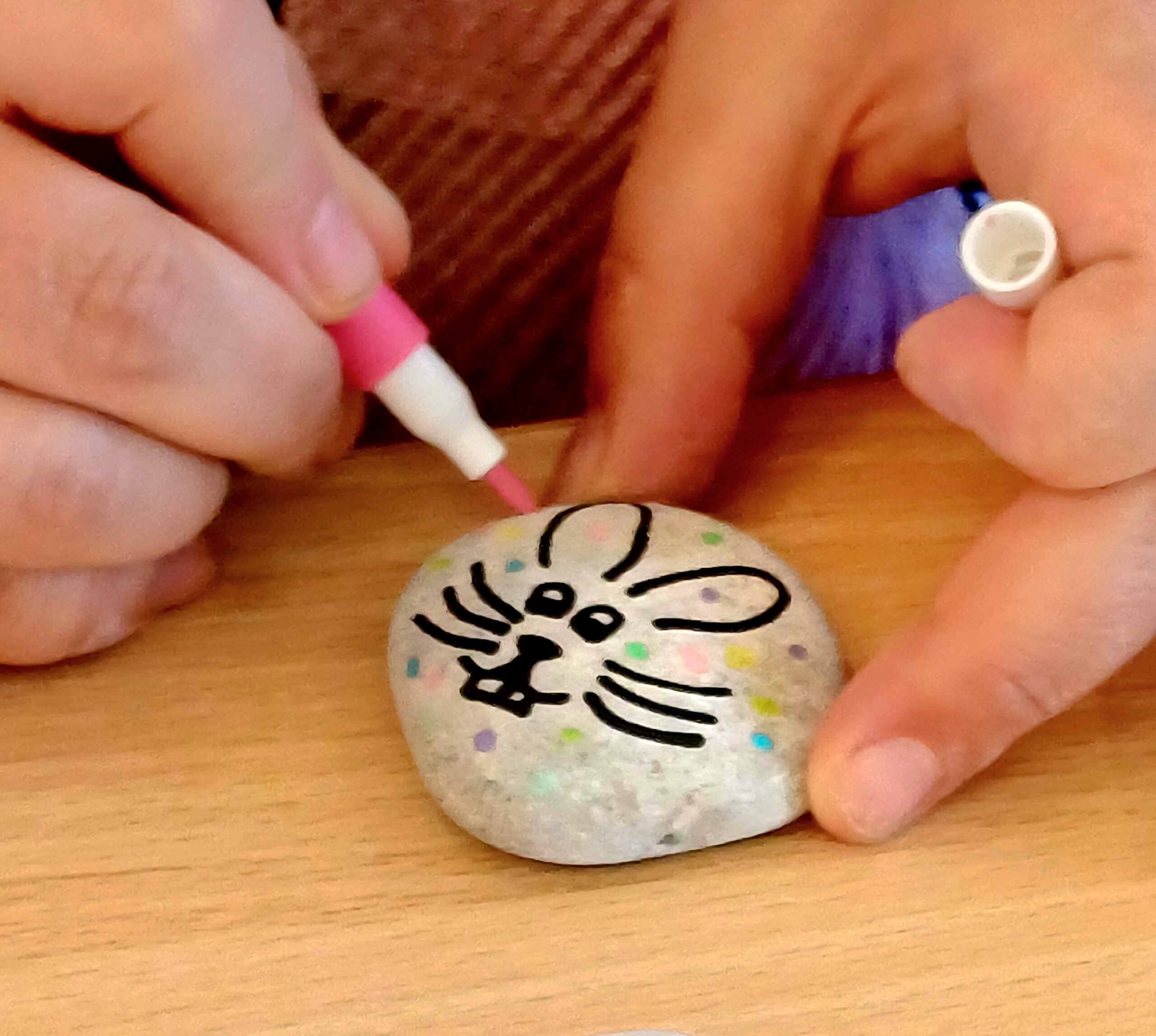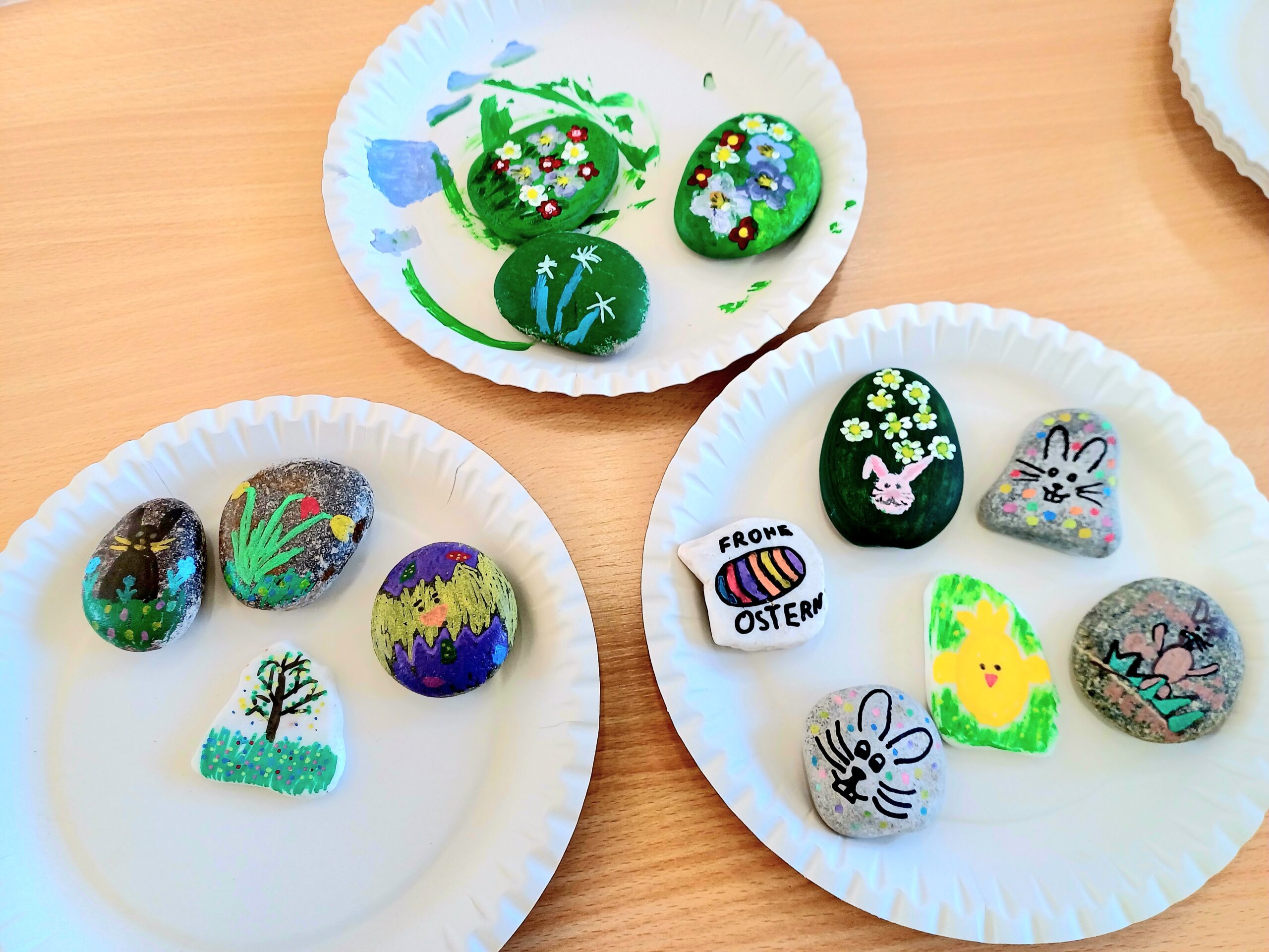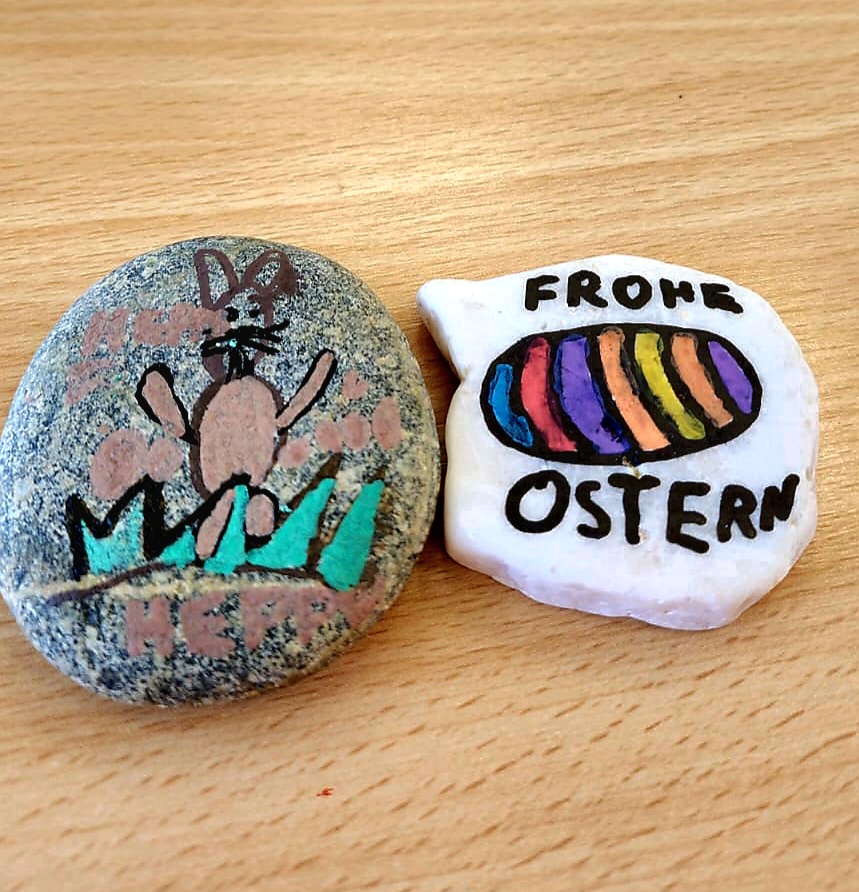 inngemäß sagte mal jemand, dass man Steine, die einem in den Weg gelegt werden, anmalen könne. So gewinnt ein Hindernis eine positive Seite. Ganz so drastisch war der Ansatz für unseren kreativen Nachmittag im Körperbehindertenkreis “Teilen macht reich” nicht zu verstehen, aber auch wir verhalfen grauen Steinen zu einer neuen Bestimmung. Mit Hilfe von Acrylstiften und -farben entstanden ganz individuelle kleine Kunstwerke, die am bevorstehenden Osterfest bestimmt so manchen Bewunderer finden werden.