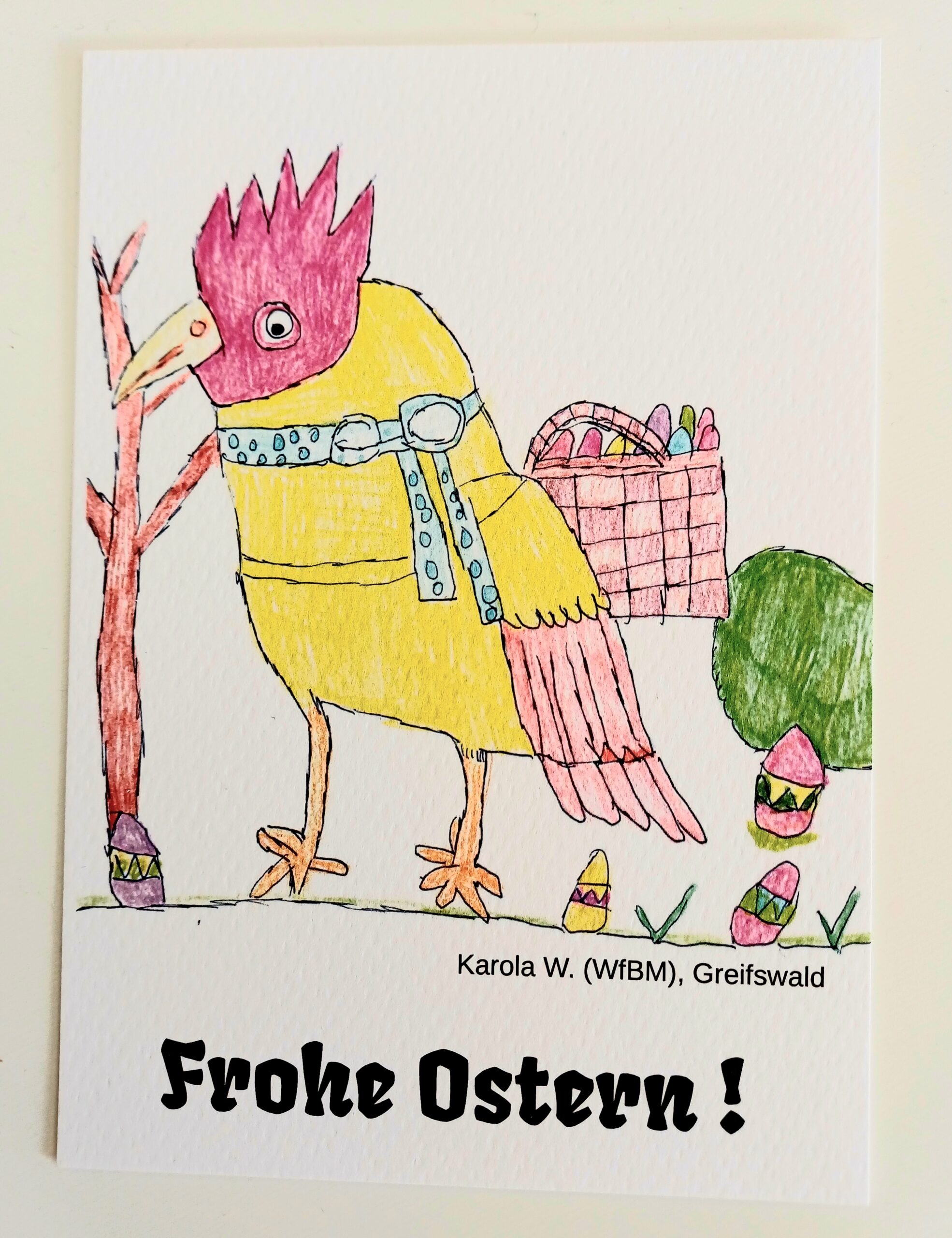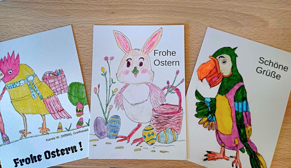 Diese handgefertigten Karten sind das Produkt von Karola W., einer Frau aus dem Körperbehindertenkreis “Teilen macht reich”. In ihrem Alltag arbeitet sie in der WfbM. Erwerben kann man die einzigartigen Karten gegen eine Spende.